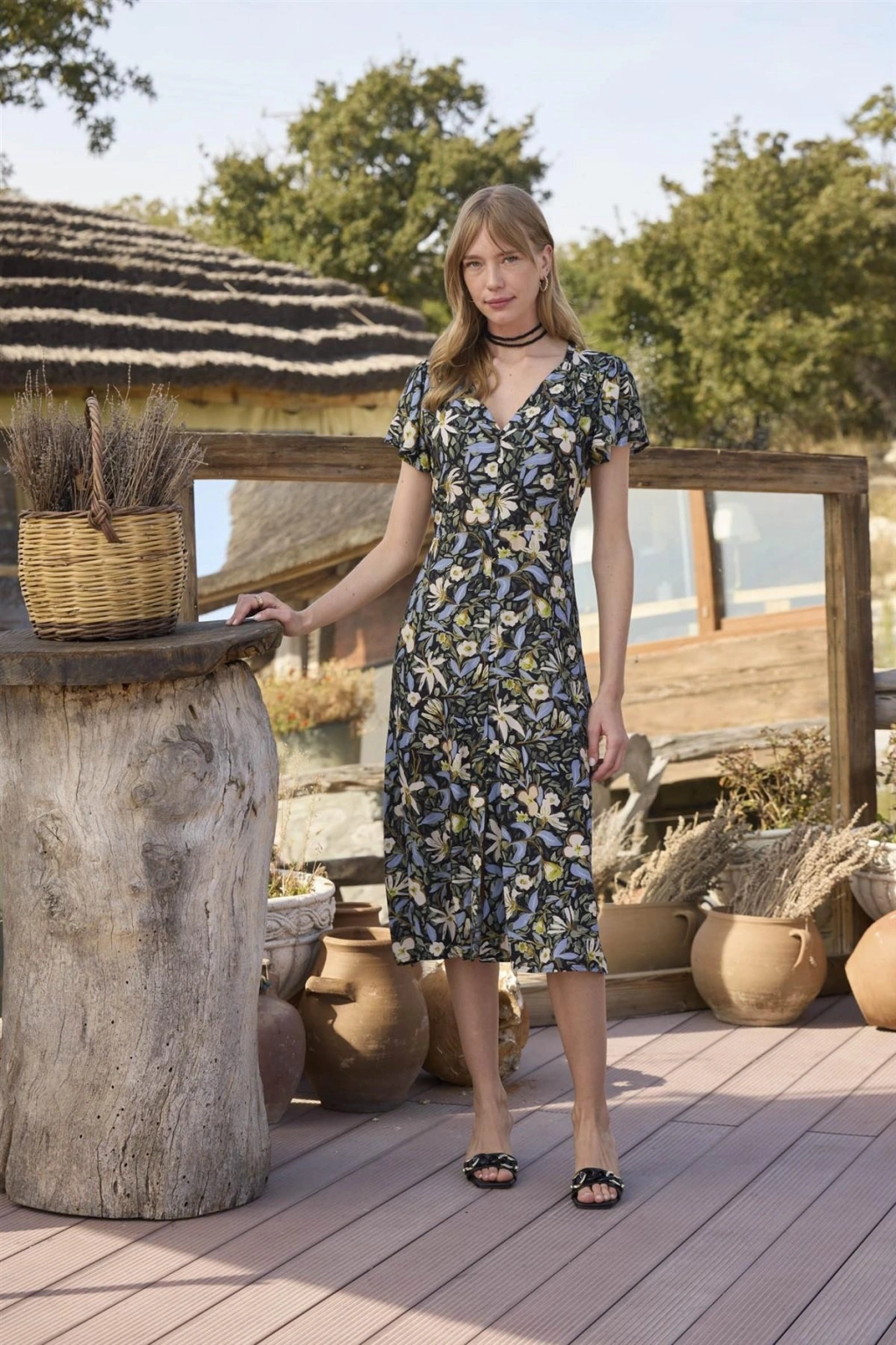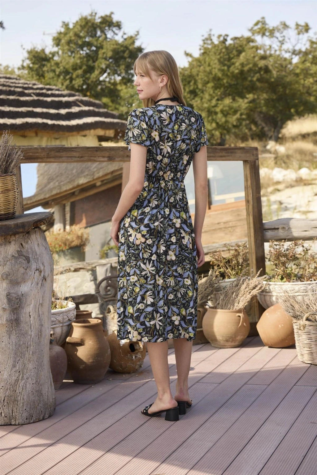 %100 Viskon Desenli Önden Düğmeli Elbise