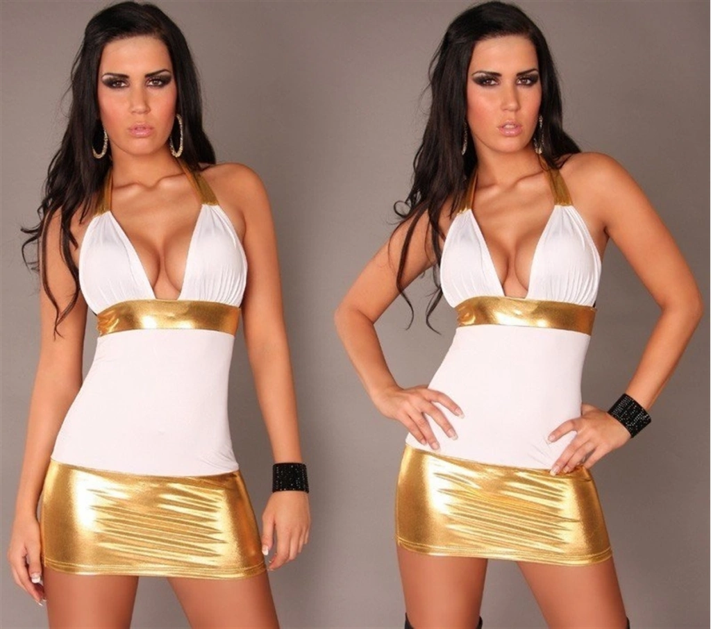 Özel Tasarım Gold Derin Yırtmaçlı Işıltılı Sırt Dekolteli Degajeli Fantezi Mini Club Elbisesi