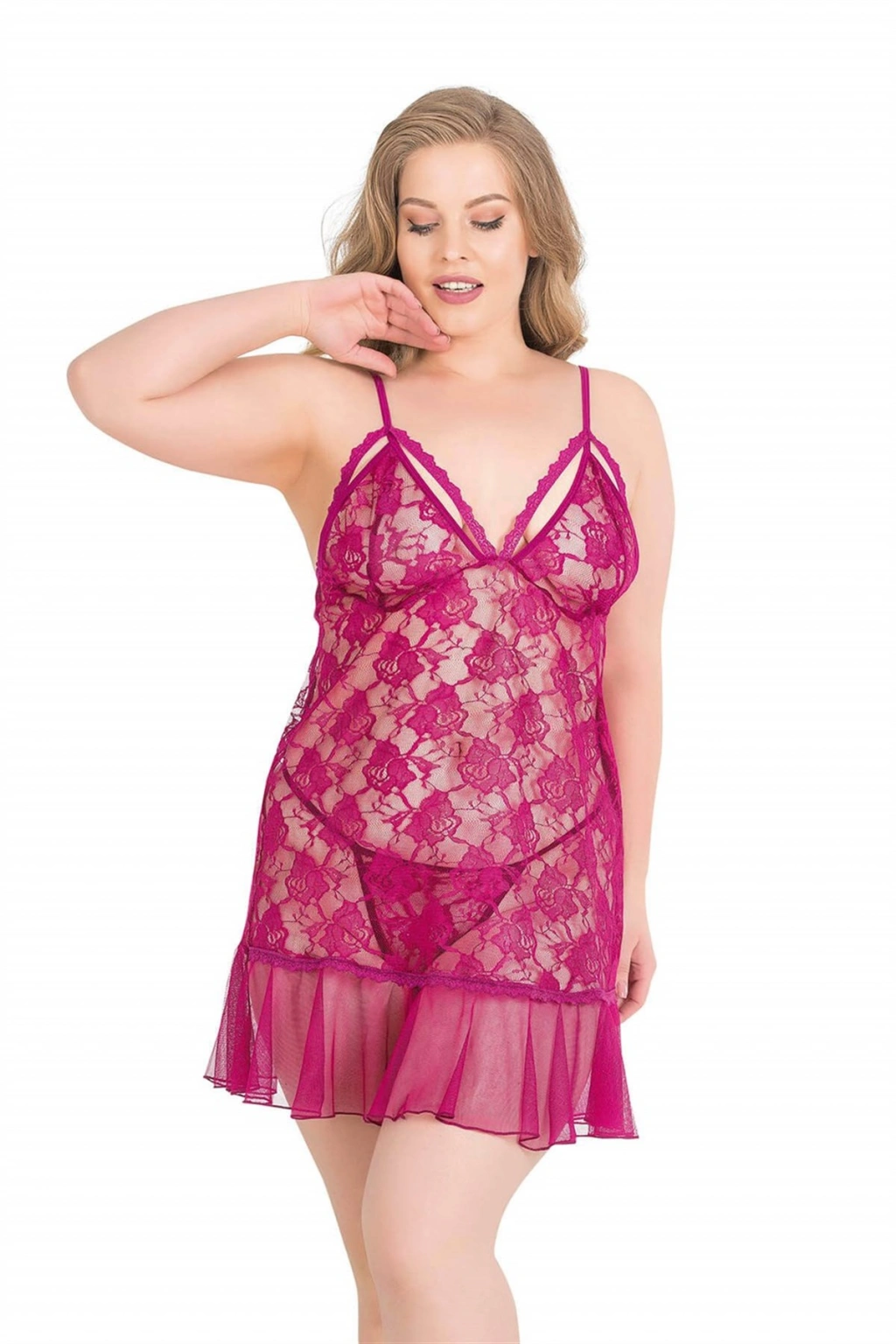 Fuşya Dantel İşlemeli Transparan Fantezi Tül Gecelik
