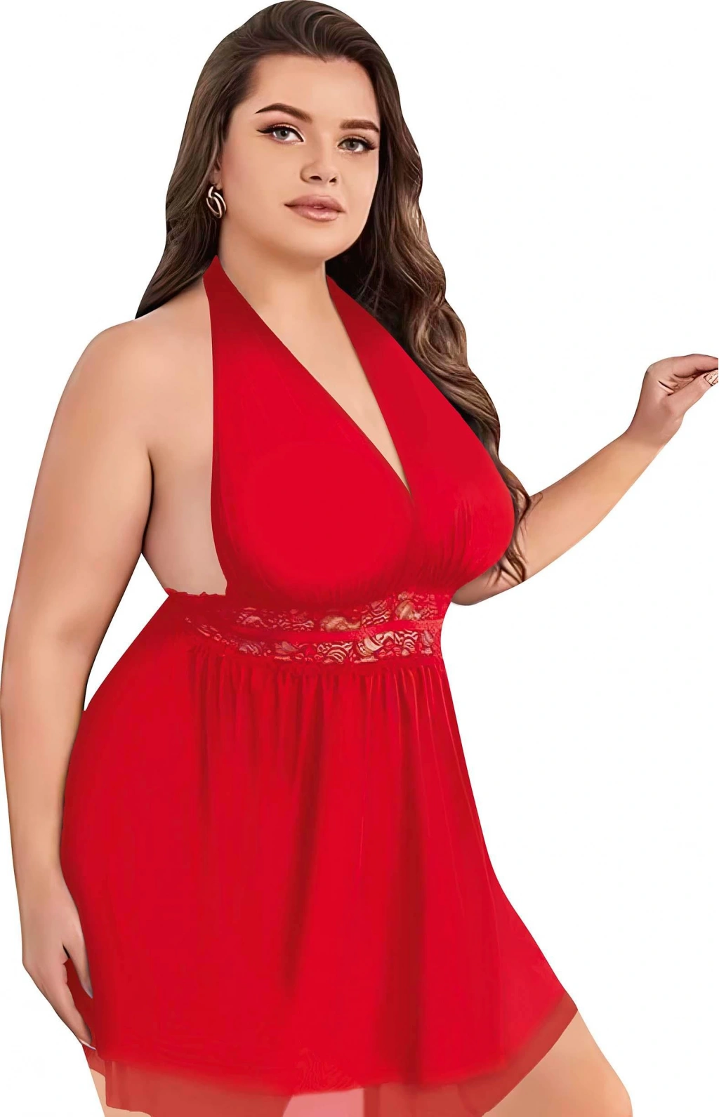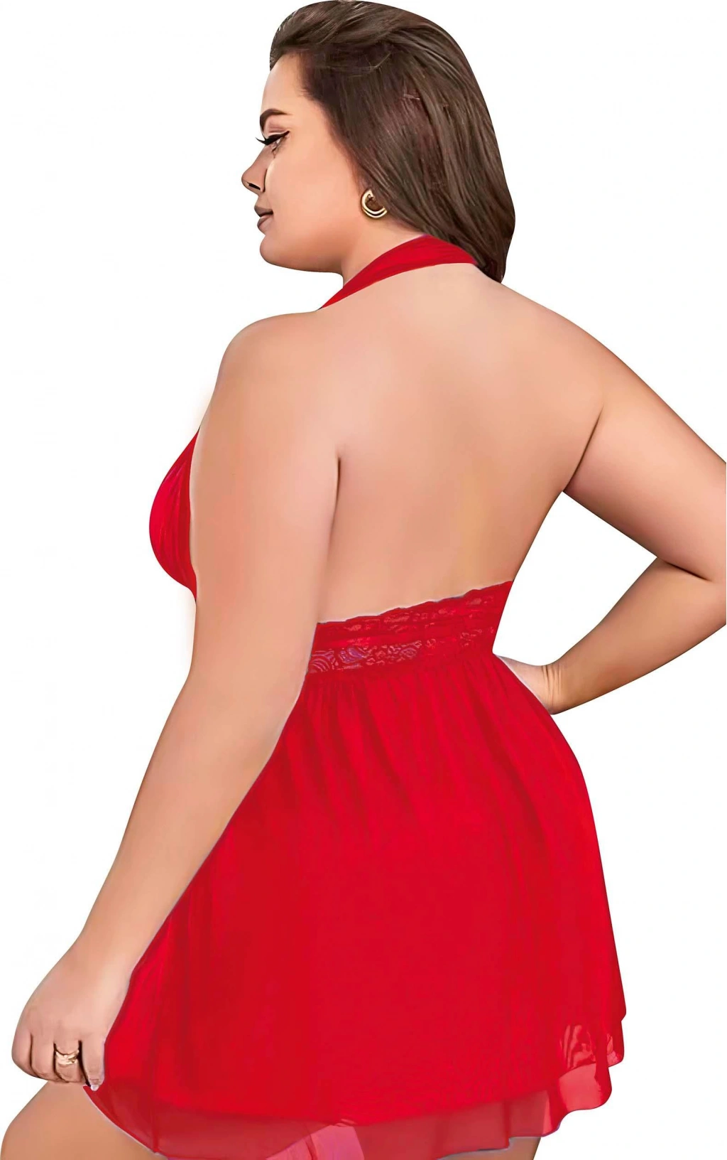 Büyük Beden Kırmızı Dantel İşlemeli Boyundan Bağlamalı Fantezi Tül Gecelik