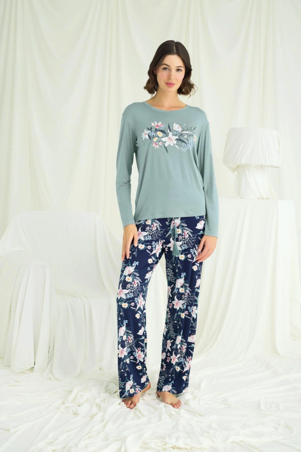 Çiçek Ve Yaprak Desenli Baskılı Pijama Takımı