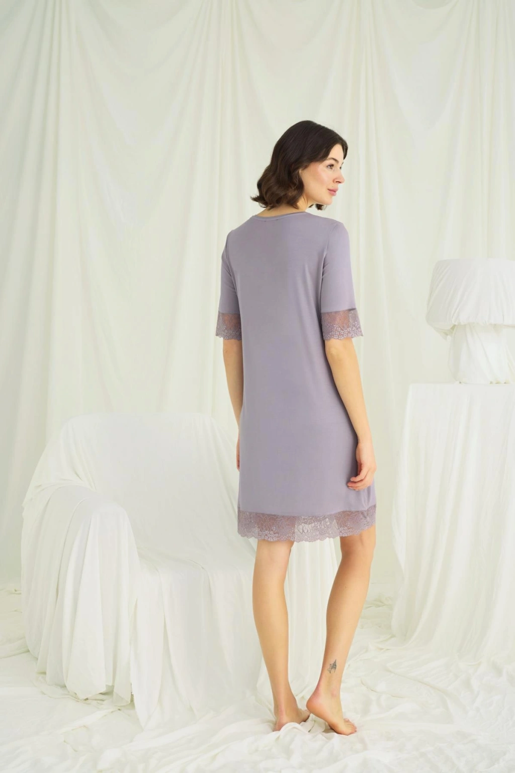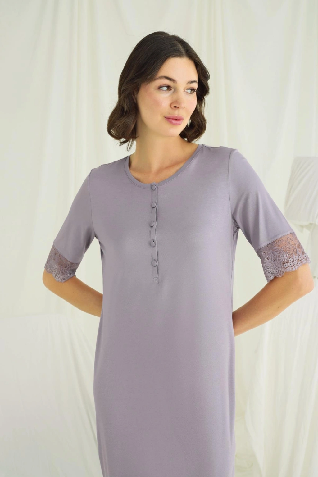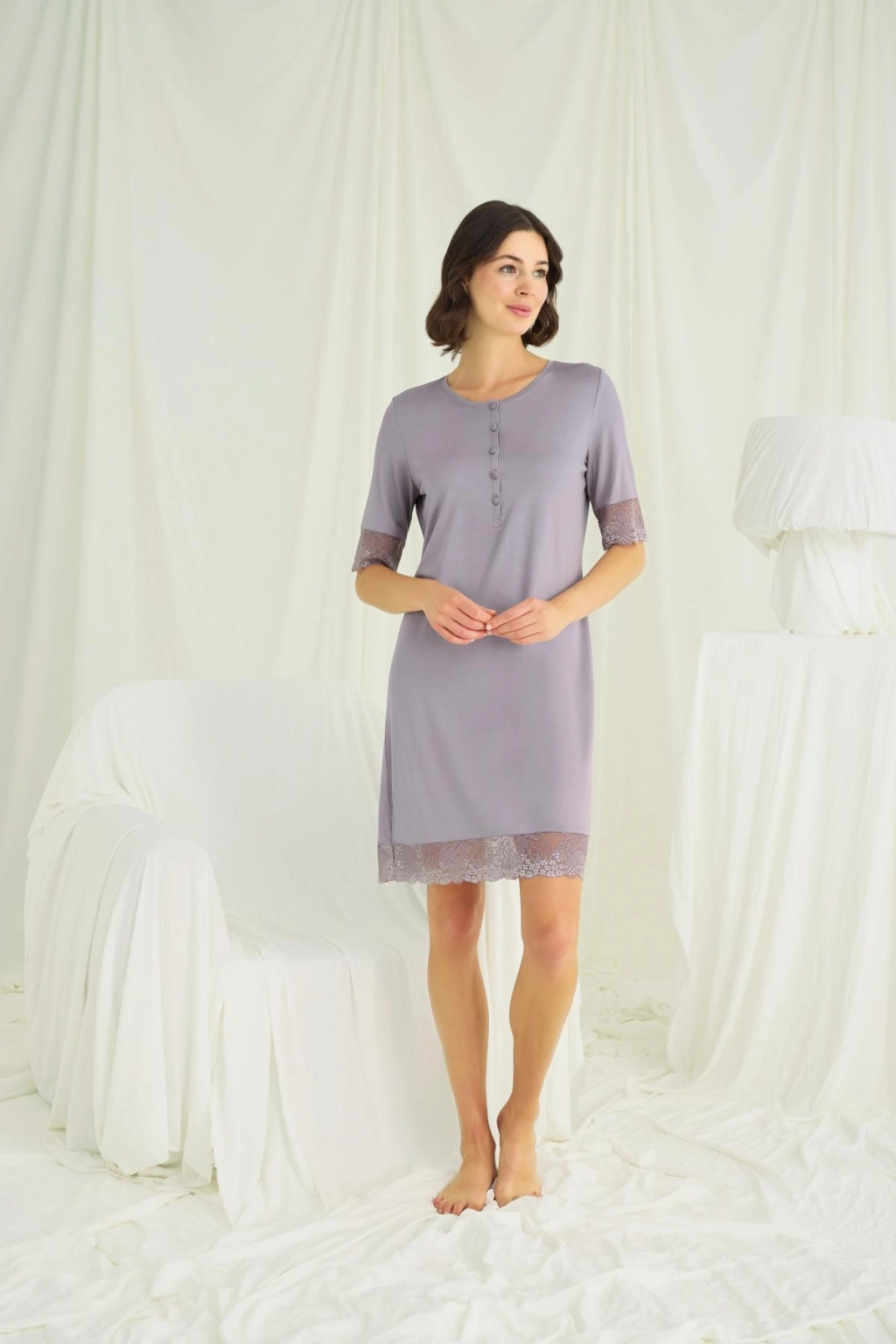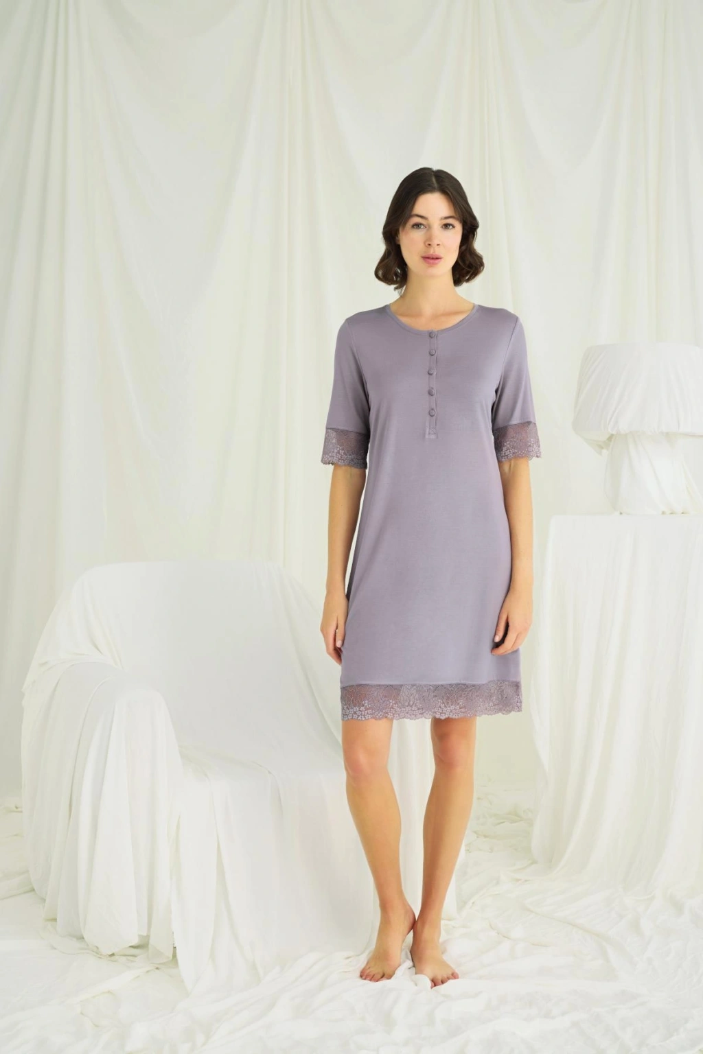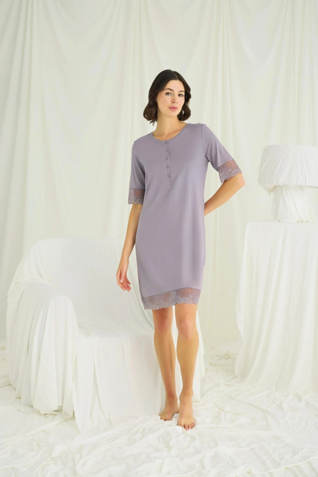 Dantel Detaylı Kısa Kollu Ve Önü Düğmeli Gecelik