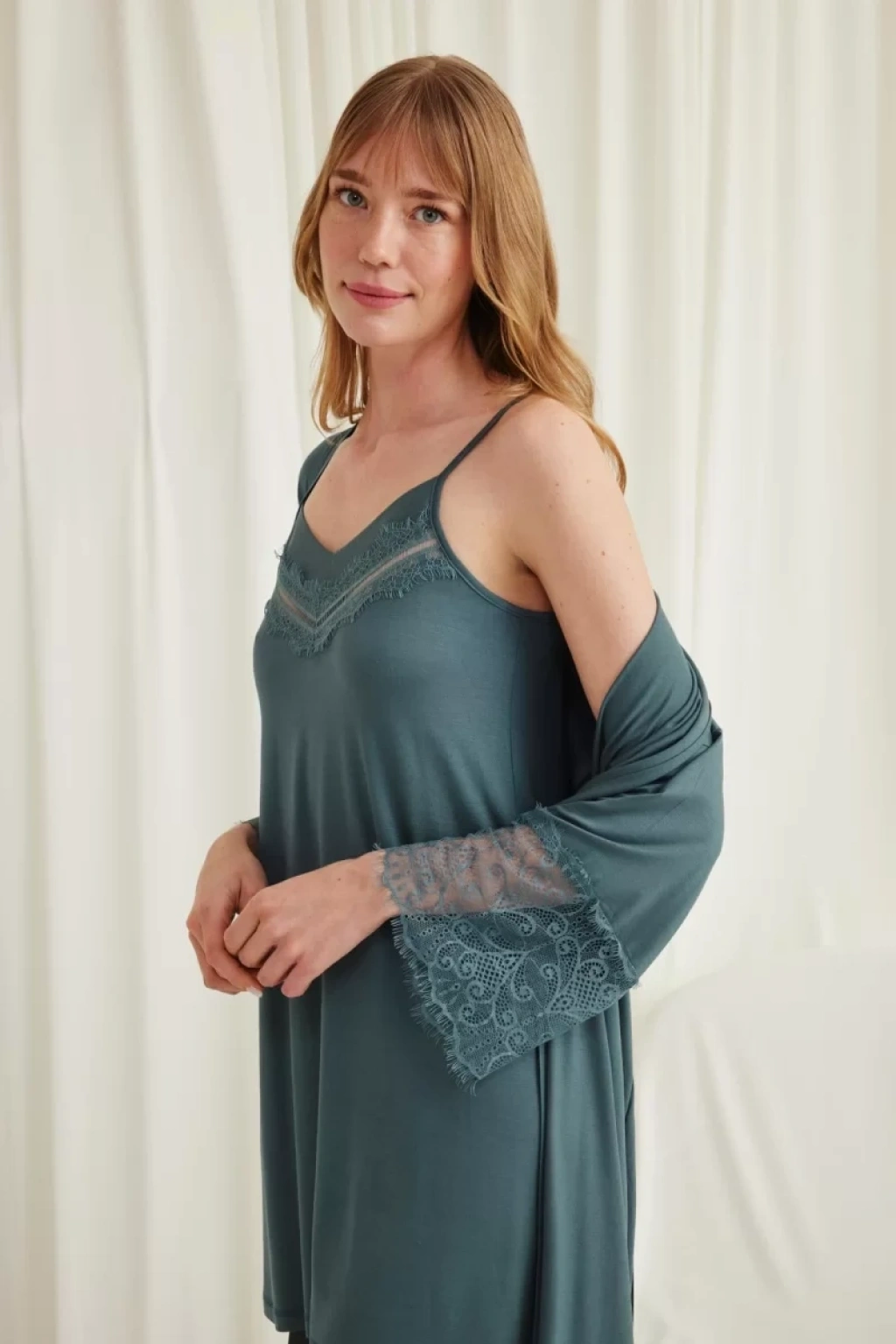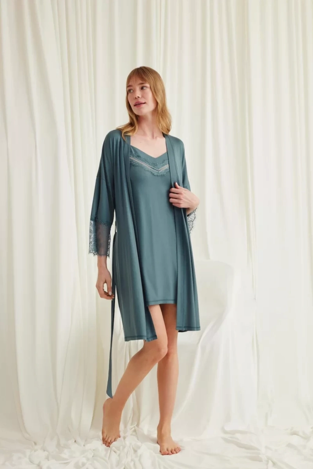 Dekolteli Yakası Ve Kolu Dantelli Sabahlık Takımı