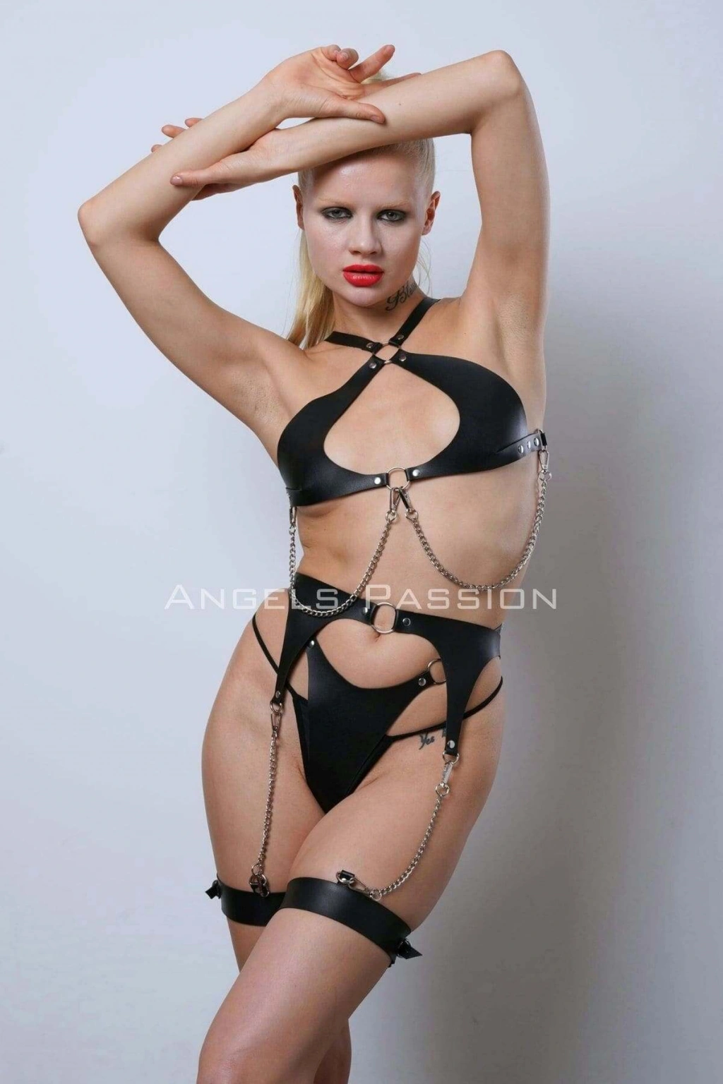Deri Fantezi İç Giyim Takım, Şık Deri Harness Set, Club Wear - Apft1330
