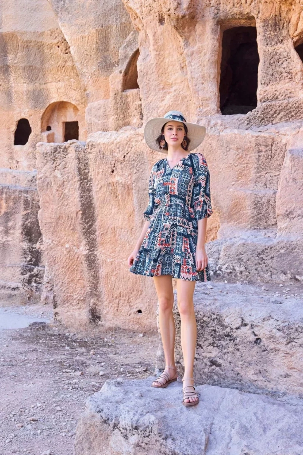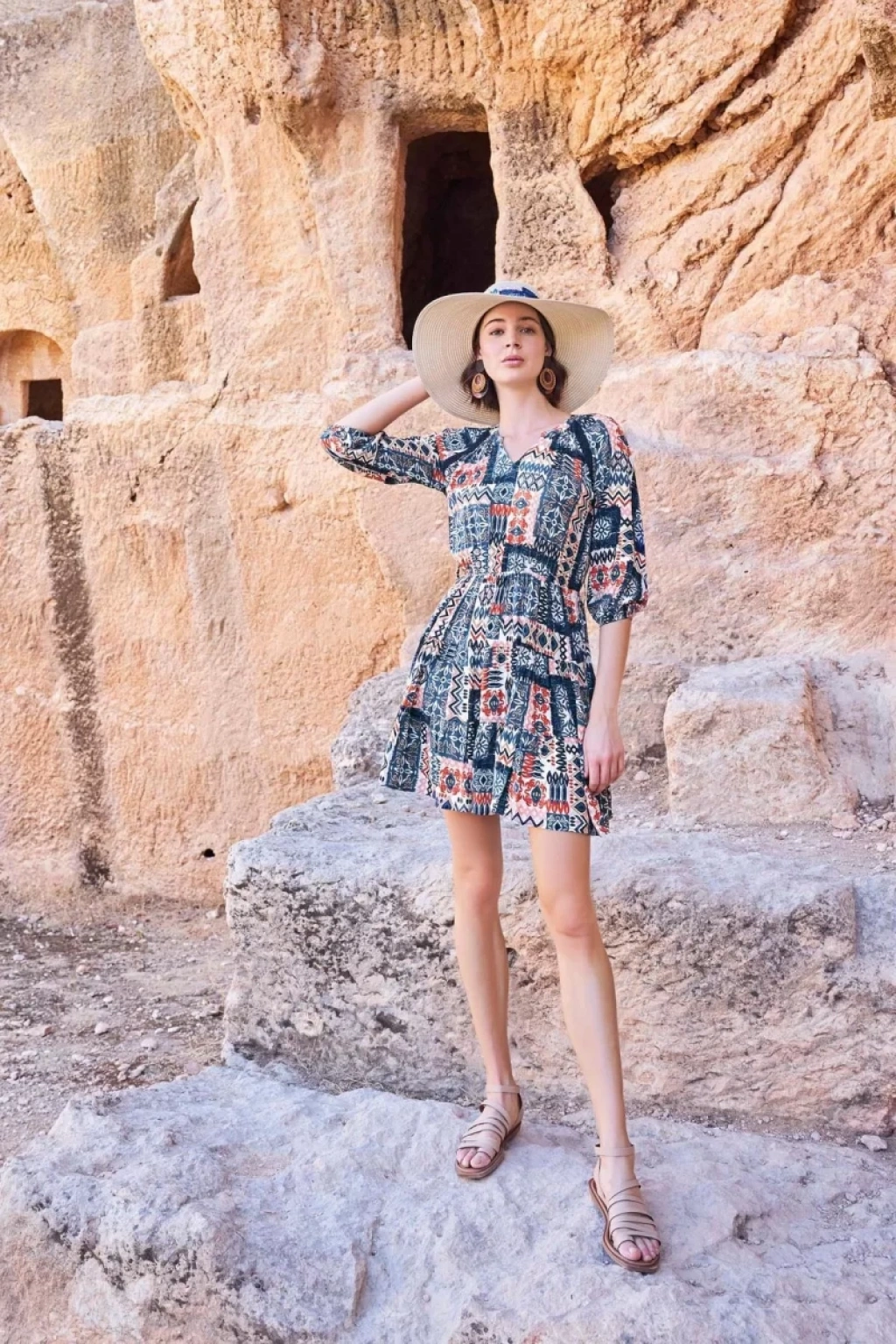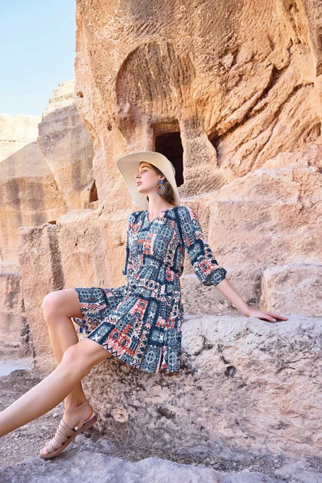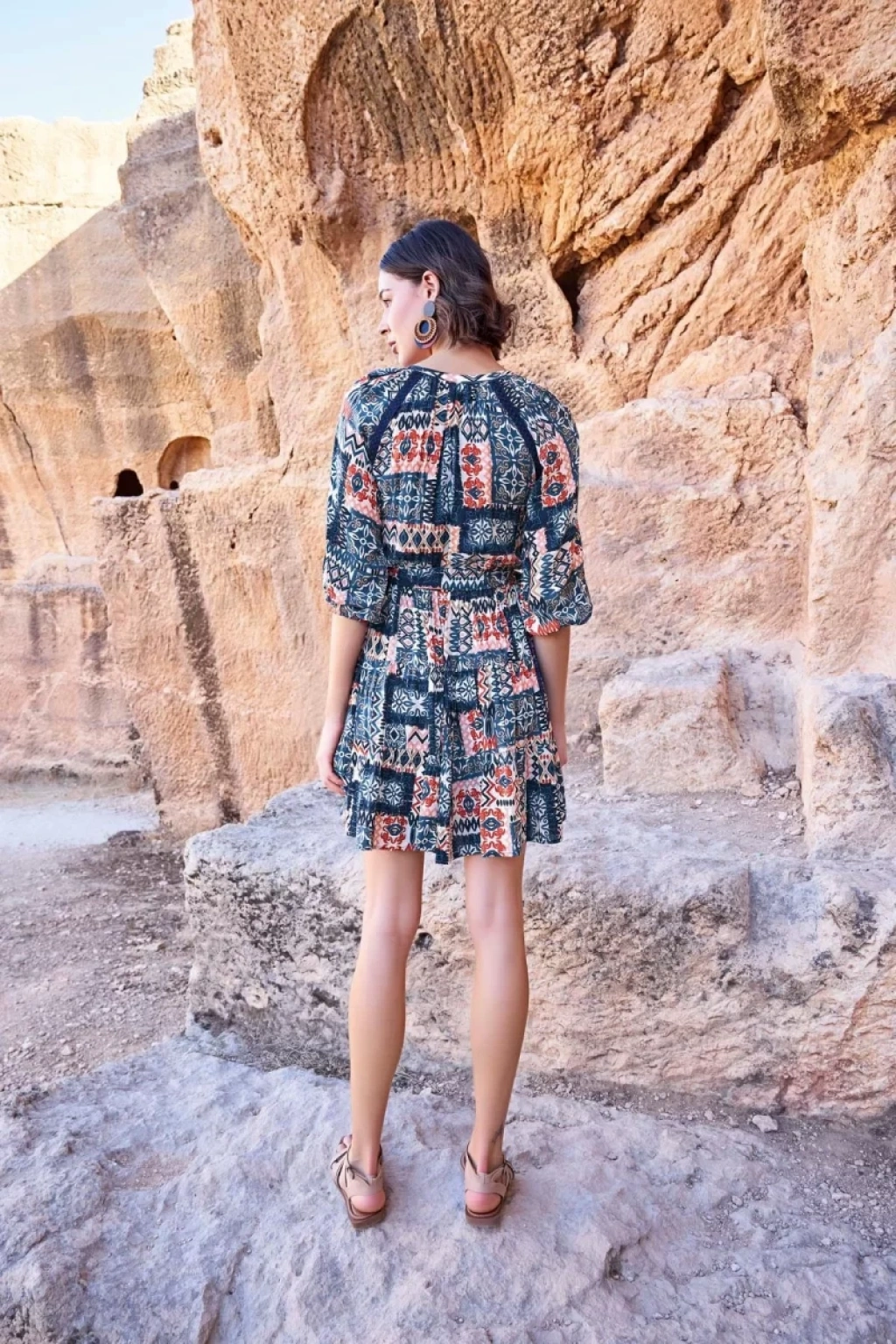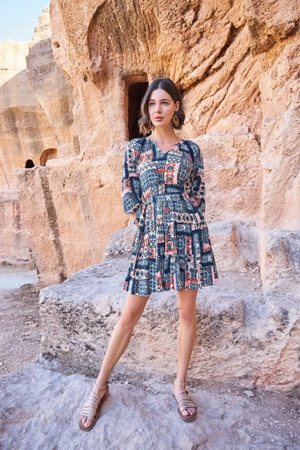 Etnik Desenli Truvakar Kollu V Yaka Elbise