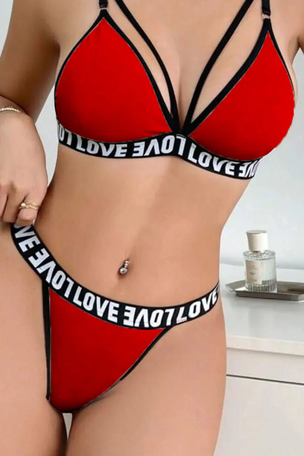 Kadın Kırmızı Love Yazı Detaylı Harness İç Çamaşır Takımı