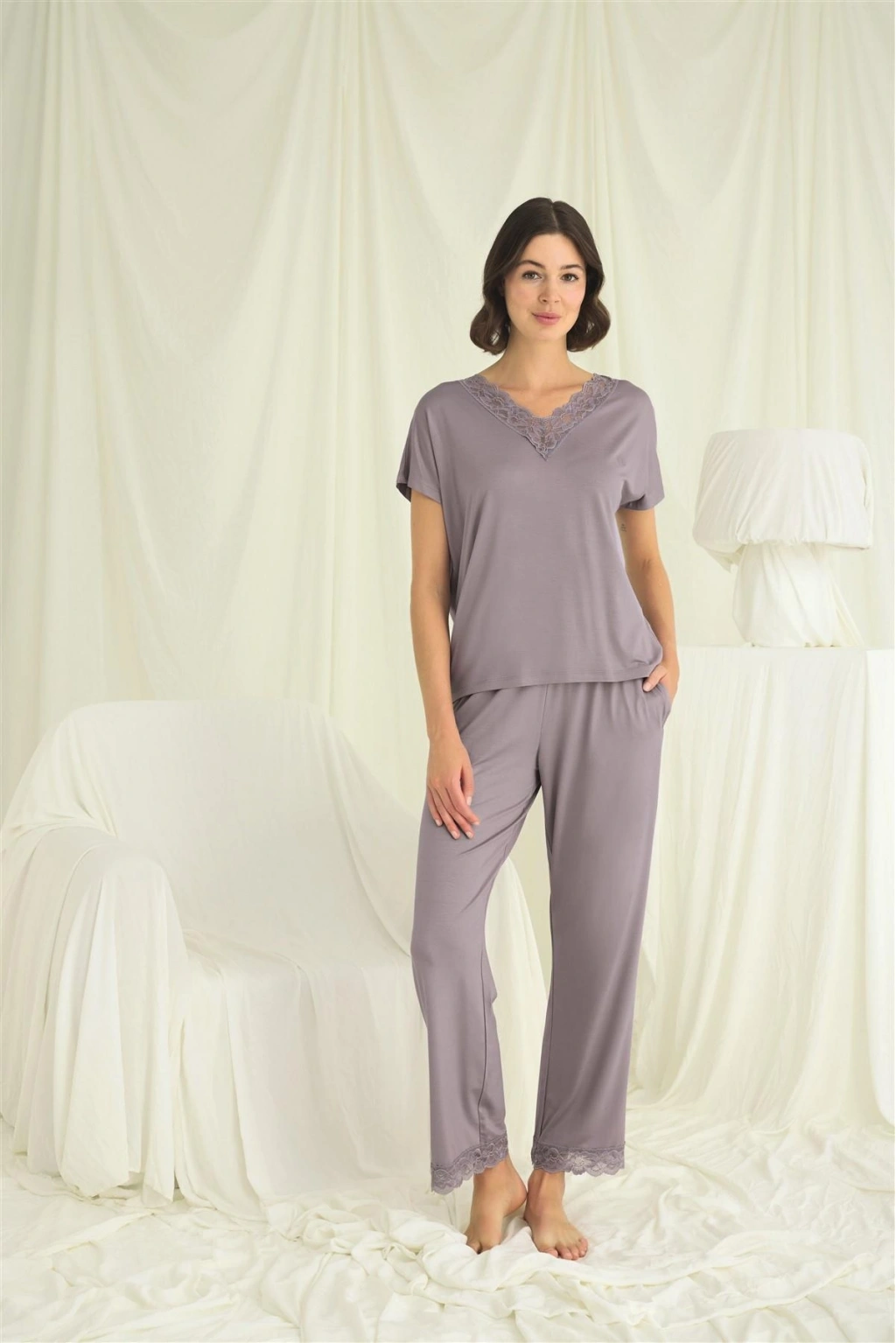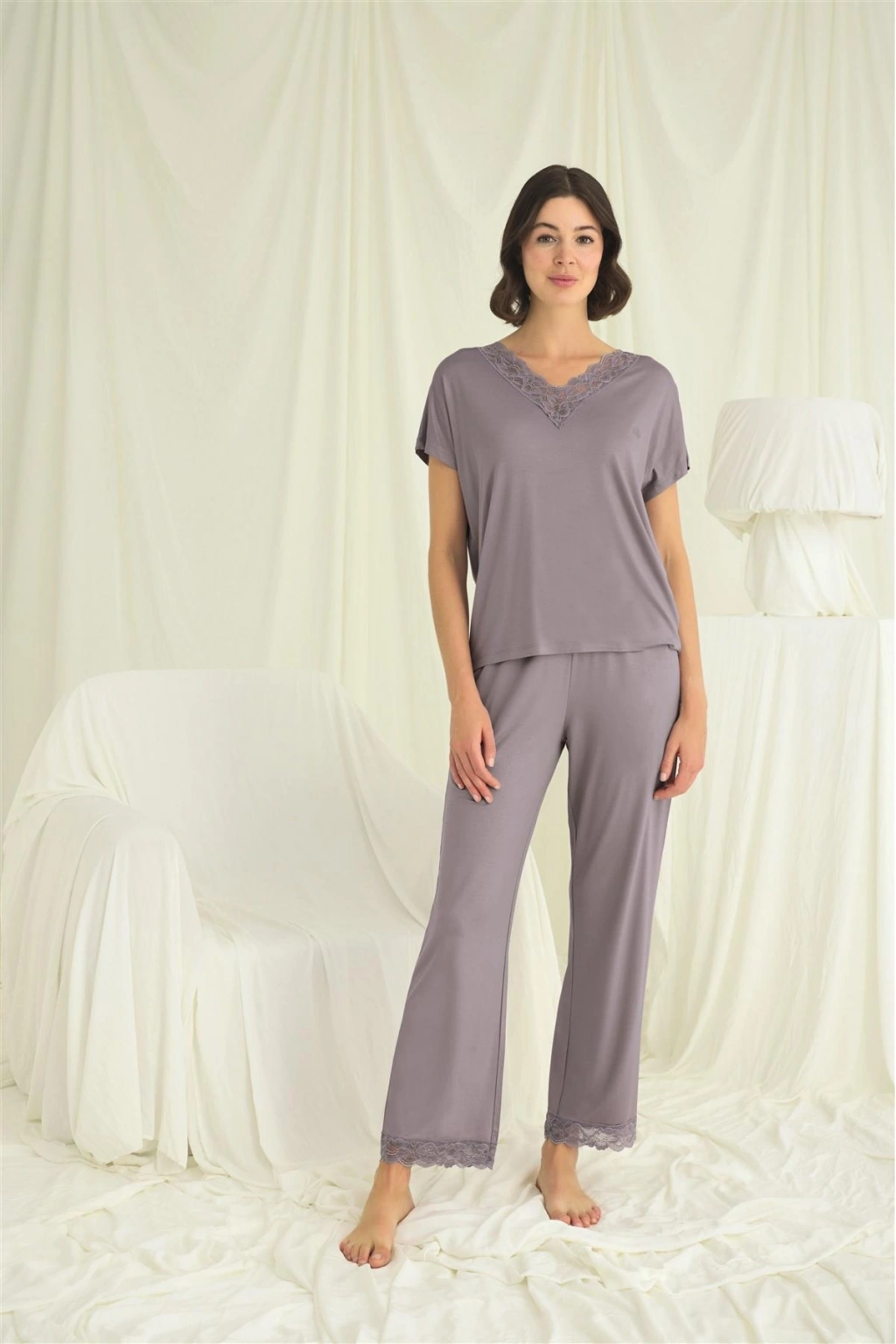 Kısa Kollu V Yakalı Dantelli Pijama Takımı
