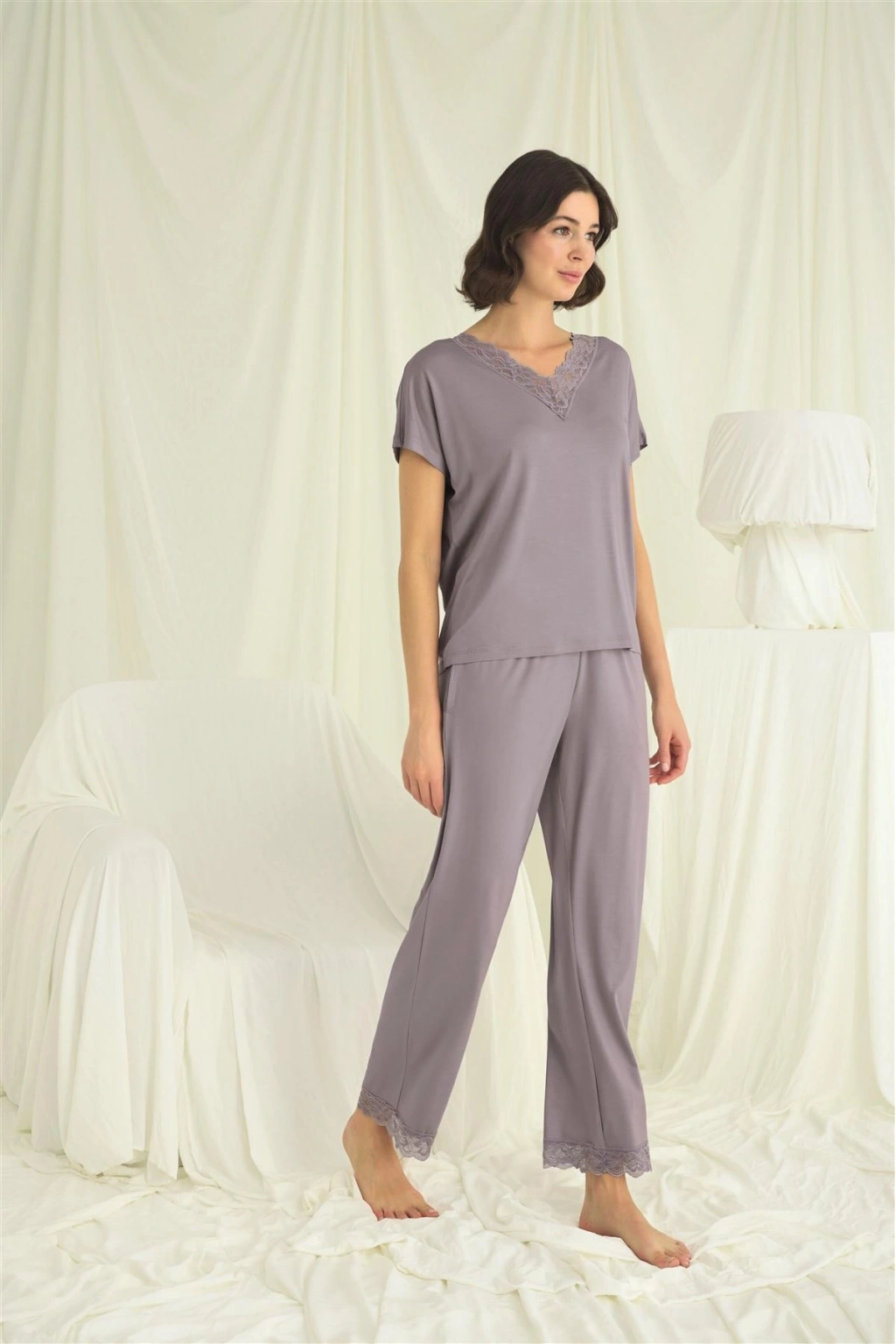 Kısa Kol V Yaka Viskon Düz Yazlık Mini Dantel Detaylı Pijama Takımı