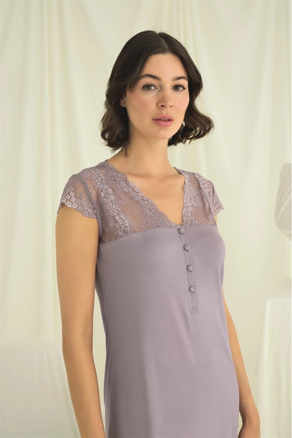 Kolu Omzu Ve Yakası Dantelli Önü Düğmeli Gecelik