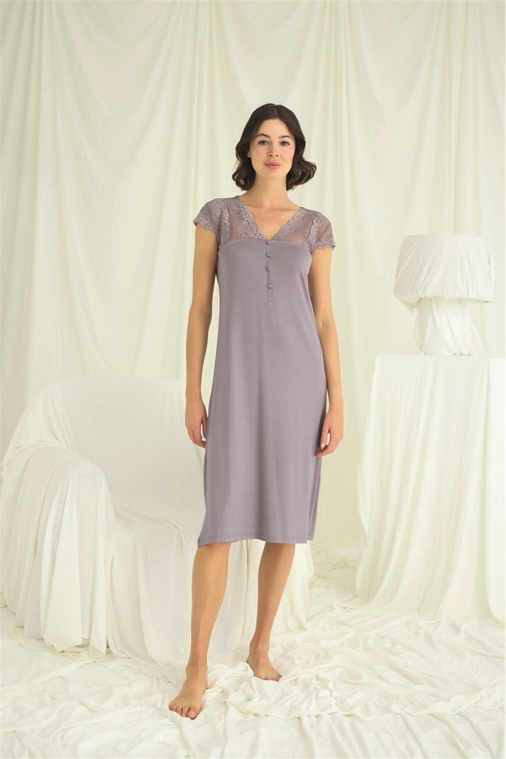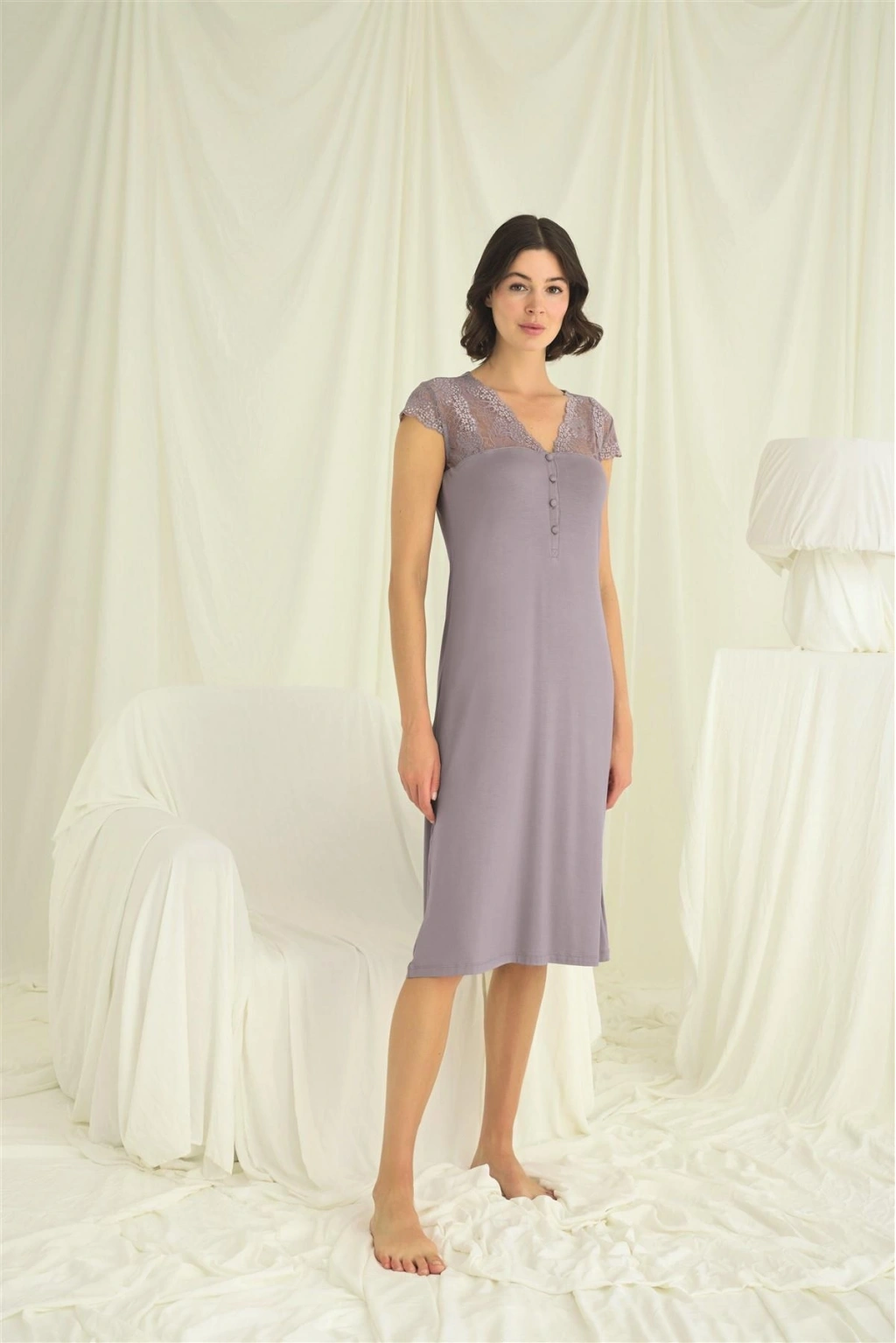 Kolu Omzu Ve Yakası Dantelli Önü Düğmeli Gecelik