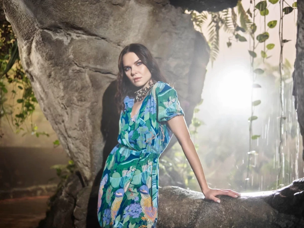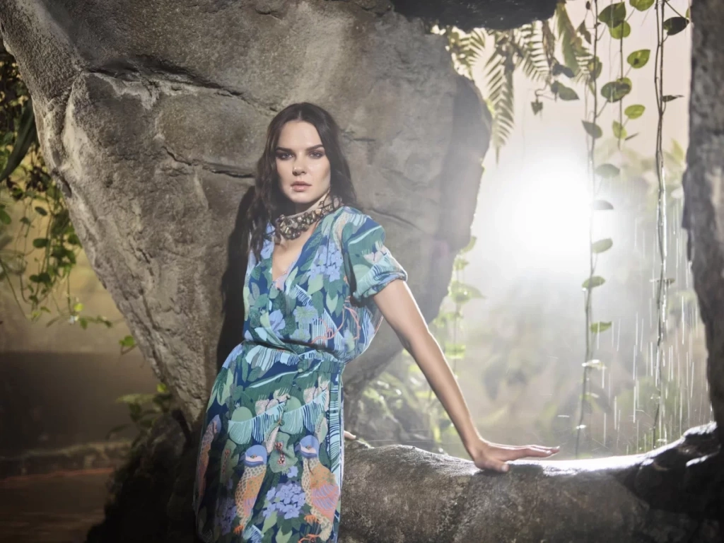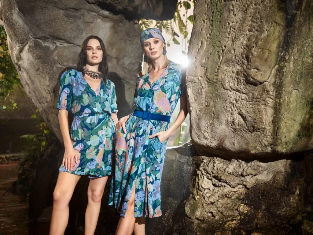Kuş Ve Yaprak Desenli Önü Düğmeli Elbise