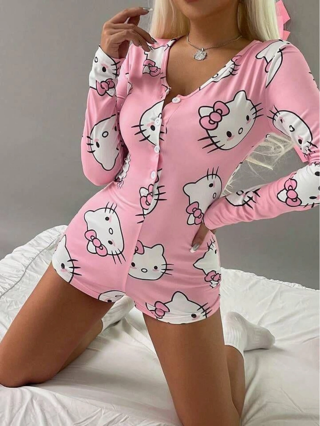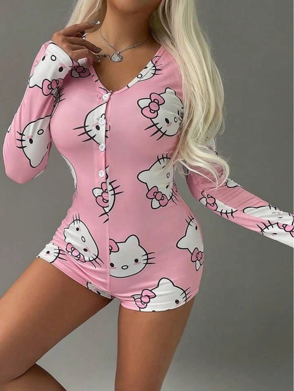 Pamuklu Pembe Hello Kitty Desenli Düğmeli Uzun Kol Tulum Pijama