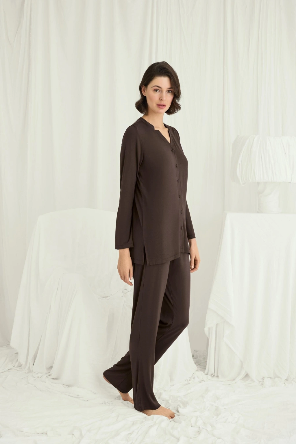 Uzun Kollu Boydan Düğmeli V Yaka Pijama Takımı