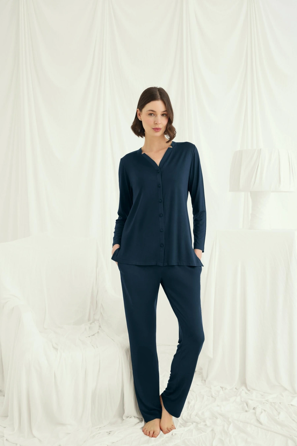 Uzun Kollu Boydan Düğmeli V Yaka Pijama Takımı
