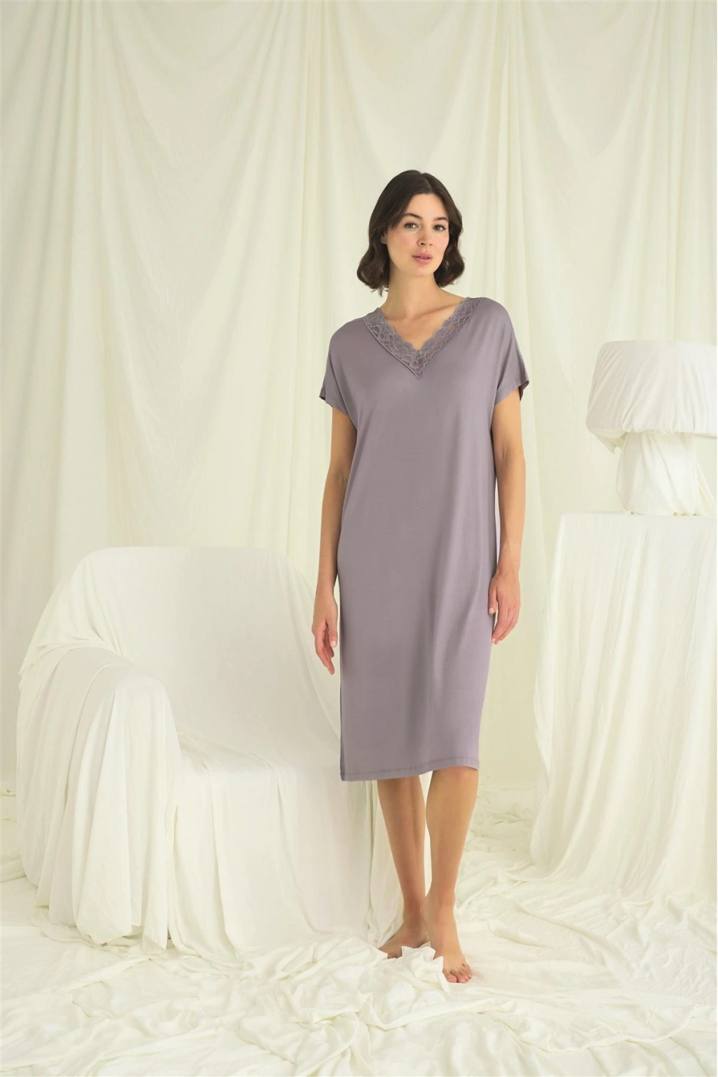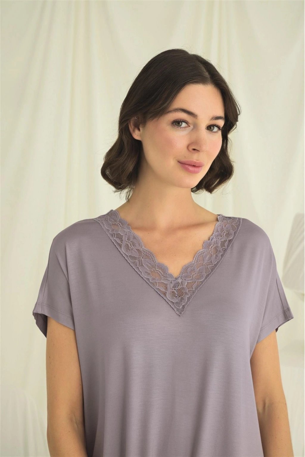 Yakası Dantelli Kısa Kollu Gecelik
