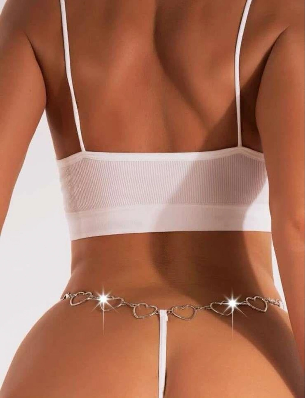 Zincir Kalp Detaylı Fantezi Beyaz String Tanga