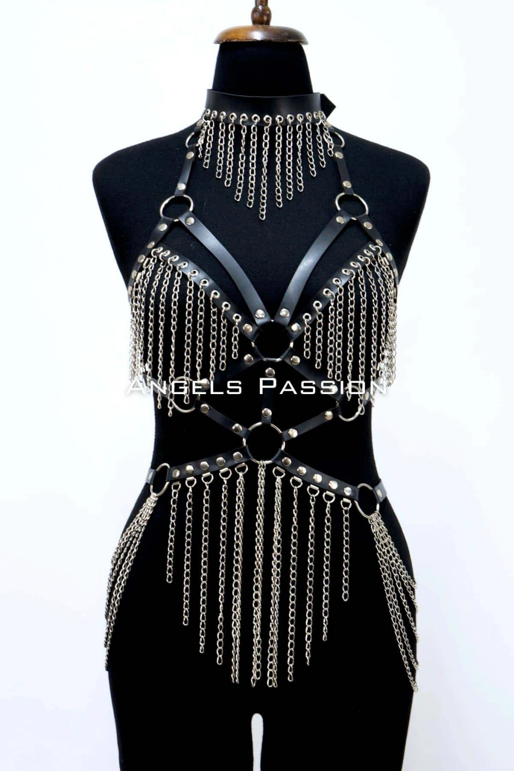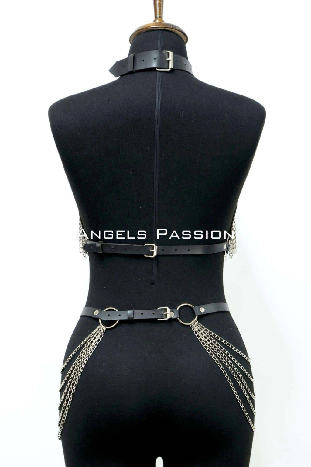 Zincirli Deri Harness, Deri Dansçı Kostüm, Choker Detaylı Deri Harness - Brf1397